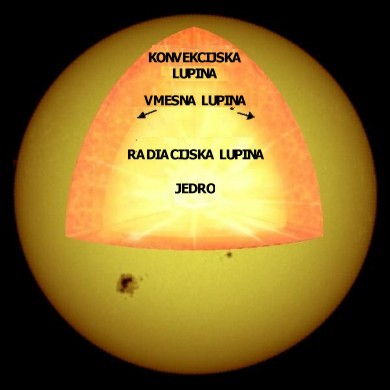 Sonce ima natanko doloèeno notranjo zgradbo. V sredièu Sonca je jedro, katerega temperatura znaa okoli 15 milijonov °C. Okoli jedra je radiacijsko obmoèje, kjer se energija iz jedra prenaa s sevanjem. Nad radiacijsko lupino je vmesna lupina, kjer se energija ustavi in pretvori v toploto. Na koncu je e konvekcijska lupina v kateri se enrgija iz jedra prenaa s pomoèjo konvekcije (meanja) snovi iz katere je Sonce. Tukaj je temperatura le e okoli 5800K. |
