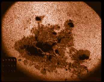 Sonèna pega, kot jo vidimo skozi teleskop. Znotraj obmoèij sonènih peg je temperatura nija za okoli 1000K. |