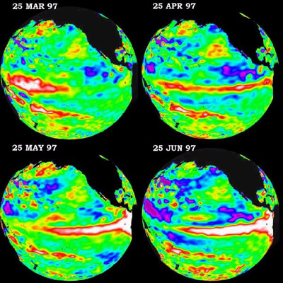 mesecev leta 1997. Bela območja pomenijo dvig med 14 in 32 cm preko normalne