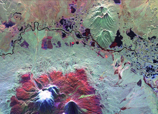 A radar image of the Kliuchevskoi volcano around the time of an eruption in