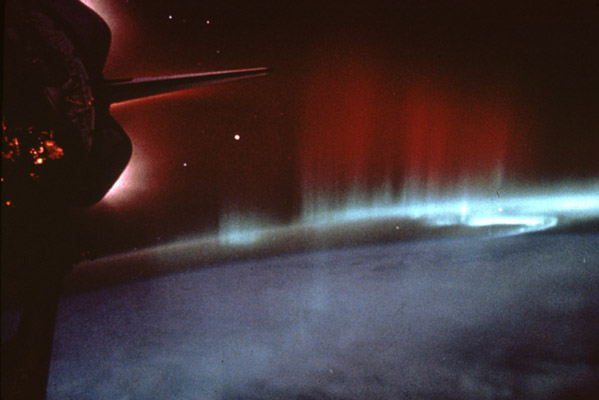 Discovery during the STS-39 mission. The aurorae are created by the emission