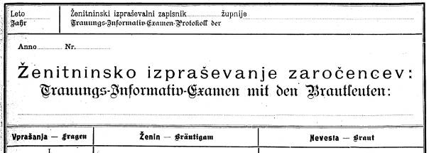 In sedaj k vsebini ženitnega zapisnika. Gre za zapisnik predporočnega spraševanja zaročencev in njunih prič. Razen tega je duhovnik vpisal tudi nekatere uradne ugotovitve, povezane s poroko. Zapisnik ima obliko vnaprej tiskanega obrazca in je vezan v knjigo. Tiskal ga je škofijski ordinariat, ki je župnikom dal podrobna pisna navodila za izpolnjevanje vsake rubrike. Če župnik od prisotnih ni dobil ustreznega odgovora ali je vanj podvomil, je moral okoliščine sam ugotoviti, po potrebi tudi z uradno poizvedbo v drugi župniji.