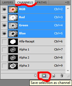 Piksle, ki smo jih izbrali v prejšnjem koraku moramo zdaj shraniti kot samostojen Alfa kanal. Klikni na jeziček Channels in potem na ikono "Save selection as a channel" (slika spodaj). Ko ustvariš alfa kanal ga lahko po želji poimenuješ z dvoklikom na ime. Izbranih pikslov več ne rabiš, saj jih imaš shranjene v alfa kanalu, zato jih odizberi s CTRL+D.