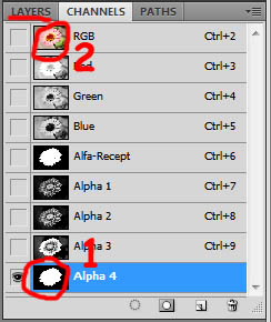 To narediš tako, da s CTRL+KLIK klikneš na predogled Alfa kanala na katerem trenutno delaš. (na spodnji sliki številka 1)