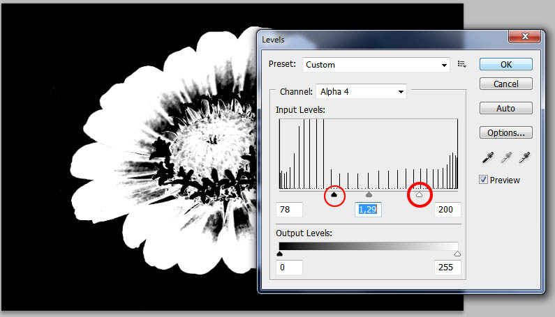 Premikaj na spodnji sliki obkrožena drsnika proti sredini, da dobiš željeni rezultat (Cvet mora imeti ostre robove, okoli cveta mora biti vse popolnoma črno). Na koncu klikni gumb OK.