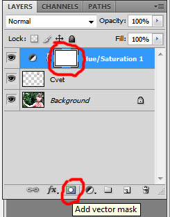 Klikni na masko uravnalne plasti "Hue/Saturation 1". Če maske še ni, jo najprej ustvari s klikom na "Add vector mask". Potem pritisni CTRL+BACKSPACE (napolni masko z izbranimi piksli). Nato pritisni CTRL+D (odizbiranje).