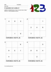ČAROBNI KVADRAT V čarobni kvadrat učenci vpisujejo manjkajoča števila tako, da je vsota treh števil v vseh smereh enaka. |