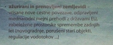 Tretja razlaga, ki se ponuja, pa je, da se je pregledna karta na konec atlasa skrila sama zaradi sramu: na njej je namreč nekajkrat manj orientacijskih podatkov (tj. zemljepisnih imen) kot na pregledni karti iz npr. leta 1996. Posamezni oštevilčeni deli Slovenije so videti kot puščava brez enega samega naselja, precej puščavski vtis pa daje tudi reliefni zemljevid Slovenije na prvem veznem listu (kdor bi sodil po njem, bi mislil, da npr. na Goričkem, Kozjanskem in v Suhi krajini ni nobenega naselja!).