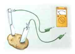 Potrebuješ krompir ali limono, v katero zabodeš dve elektrodi (cinkovo in bakreno ploščico) ter instrument, s katerim boš lahko meril tok, ki teče med elektrodama. |