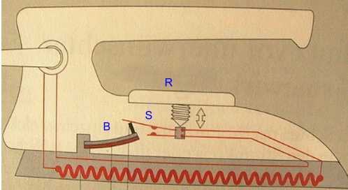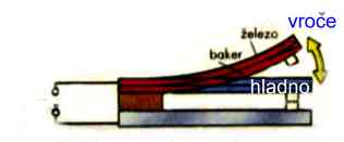 Ko se bimetal segreje, se bakreni trak raztegne bolj kot železni, zato se bimetal ukrivi in s tem prekine električni krog. Stikalo izključi grelec. Ko se bimetal dovolj ohladi, se spet vrne v prvotno lego in s tem vključi grelec. S tem avtomatsko vzdržujemo temperaturo v določenem območju. |