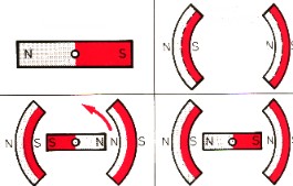 Istoimenska pola se odbijata in povzročita zasuk tuljave, ki je nameščena na osi. |