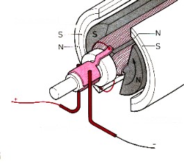 1. Magneta 2. Tuljava, navita na kotvi -rotor 3. Komutator (spreminja smer toka in s tem vzdržuje gibanje tuljave) |