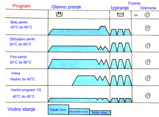Pralni program prikazan v obliki tabele