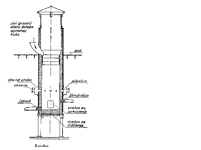 Kupolka sestoji v glavnem iz dveh delov, iz talilnika in jaška. Talilnik ima ob dnu odprtino - izpust, skozi katerega izteka raztaljena siva litina. Nekoliko više je žlindrnica, skozi katero izpuščamo žlindro. Obe odprtini zapiramo z glinnastim čepom. Ob gornjem robu talilnika je več pihalic, skozi katere vpihavamo zrak v kupolko. Od dnu talilnika so tudi vratca za čiščenje peči in vratca, da lahko peč zakurimo, ko začnemo obratovati. Nad talilnikom je 3 - 6 m visok jašek s premerom 500 - 800 mm.