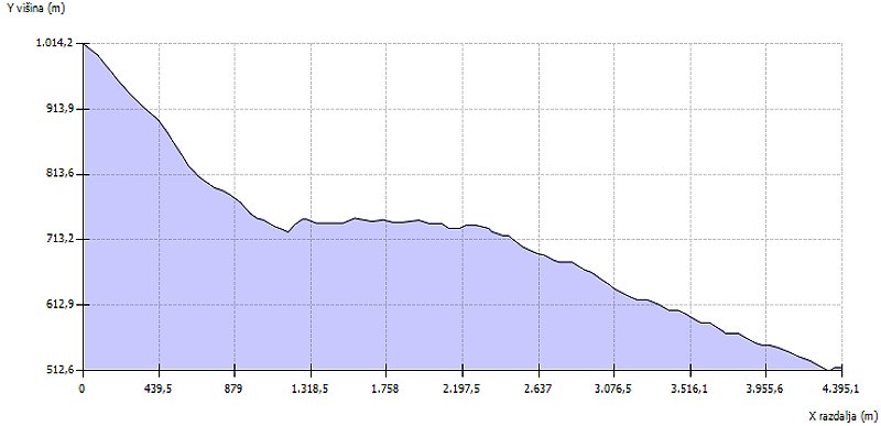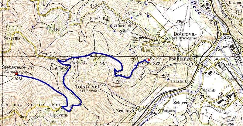 [ nazaj na osnovno stran ] KT 01 (Šteharski vrh, 1013m) - KT 02 (Sveti Križ pri Dravogradu, 528m) Na zemljevidu Višinski graf (KT 01 proti KT 02) Povzetek poti - višina, razdalja