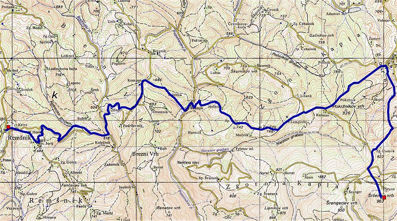 [ nazaj na osnovno stran ] KT 07 (Remšnik, 868m) KT 08 (Sršenov vrh, 965m) Na zemljevidu Višinski graf (KT 07 proti KT 08) Povzetek poti - višina, razdalja