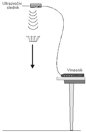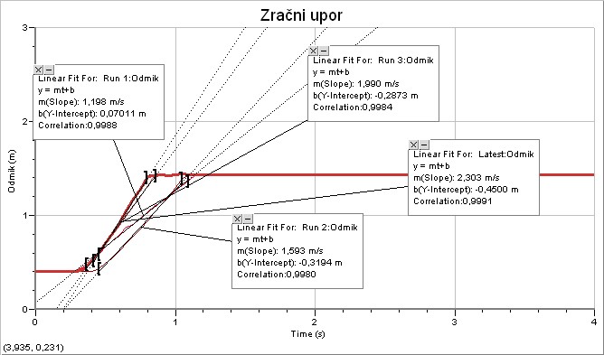 Navodilo: Ultrazvočni slednik priključimo na kanal DIG/SONIC 1 na vmesnik LabPro. Pritrdimo ga na strop vsaj 2 metra nad tlemi, tako kot prikazuje slika 1. Odpremo datoteko 13 Air Resistance v mapi Physics with Computers. Posodico za pecivo položimo na dlan in držimo roko približno 0,5 m pod slednikom. Kliknemo Collect za zbiranje podatkov. Ko zaslišimo zvok, ki ga oddaja ultrazvočni slednik, spustimo posodico tako, da pada brez rotiranja navpično proti tlom. Roko odmaknemo čim hitreje, tako da slednik zapisuje samo podatke o gibanju posodice. LoggerPro nariše graf končne hitrosti v odvisnosti od časa. Končna hitrost je določena z nagibom krivulje. Nagib krivulje določimo tako, da kliknemo in povlečemo ter omejimo ravni del krivulje. S klikom na gumb Linear Fit Button, določimo nagib premice. Podatek vnesemo v preglednico in meritve večkrat ponovimo.