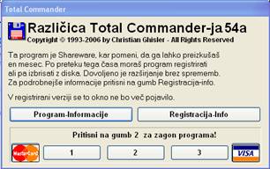 Program je namestil tudi bližnjico za zagon med programe v meniju Start. Za zagon izberemo bližnjico Total Commander 32 v istoimenski mapi. Ob zagonu se nam pojavi okno, ki nas opozori o nelicenčni uporabi programa in nam ponuja podatke o programu ter o načinu registracije programa (slika 55 levo). Za uporabo programa moramo izbrati gumb (1, 2 ali 3), za katerega je navedeno (napis nad omenjenimi gumbi), da zažene program. Nato se nam (ker smo prvič zagnali program) pojavi okno z nastavitvami, kjer lahko nastavimo praktično vse od barv, pisave, do nekoliko bolj tehničnih nastavitev (slika 55 desno). Ker bomo te nastavitve spreminjali kasneje, jih sprejmemo takšne, kot so, z izbiro gumba Vredu.