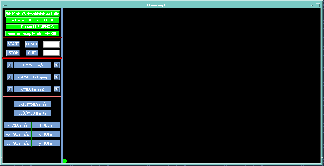 , s katerimi lahko poženemo simulacijo, jo ustavimo na določenem mestu ter popolnoma ustavimo. V vsakem trenutku lahko tudi vidimo komponente hitrosti, čas ter pot in višino, na kateri se nahaja kroglica. Ko je kroglica v najvišji legi se nam na ekranu izpišejo vsi podatki, ki ostanejo vidni do konca simulacije. Skratka možno je nastaviti ter odčitati vse pomembne parametre.4.2. IZDELAVA PROGRAMA POŠEVNI MET PO KORAKIH