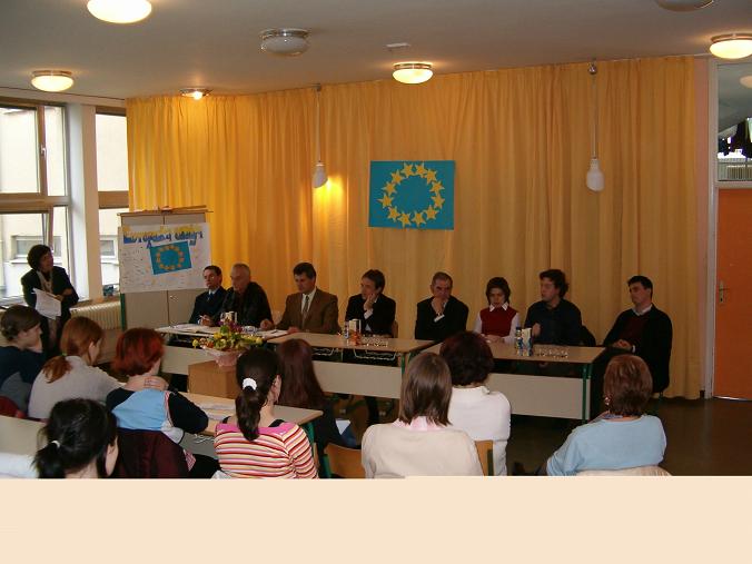 je vodila naša ravnateljica, ga. Ivana Slamič. Pridružili so se nam: Odgovorili so na vsa vprašanja naših učencev ter nam povedali marsikaj novega o EU. Vsi so poudarili pomen znanja, skrb za slovenščino in slovensko identiteto nasploh. Dejali so, da nam sam vstop v EU ponuja veliko novih poti, od nas pa bo odvisno, kako jih bomo znali izkoristiti. V maju 2004 bo izšlo šolsko glasilo, v katerem bo predstavljen