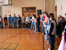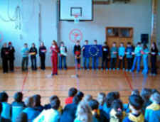 | OŠ Velika Polana Dejavnosti: Naša šola se je v letošnjem šolskem letu prvič vključila v aktivnosti »Pomladni dan v Evropi 2004«. Učenci aktivno sodelujejo v različnih aktivnostih: • projekt MOJE PRAVICE – Šola za mir • delavnica v okviru nevladne organizacije KLJUČ, ki se bori proti trgovanju z ljudmi; • v okviru OTROŠKEGA PARLAMENTA, katerega letošnja tema so humani medsebojni odnosi; • v delavnici v okviru Unicefa, na temo vloga izobraževanja kot pomemben faktor preprečevanja socialnega izključevanja otrok; • Učenci od 1. do 3. razreda so spoznali »deželo barv«, okroglo kot kolač, razdeljeno na štiri dele, strogo ločene z mejo. Spoznali so dečka Grahka, ki je živel v zelenem delu. Bil je ves zelen, tako kot je po pravilih, toda na ličkih je imel tri pikice: rumeno, modro in rdečo. Bil je drugačen od ostalih. Ves nesrečen je nekega dne odšel na zeleno podstrešje in našel babičino skrinjo. Odprl jo je in iz nje se je zaslišala glasba, ki je bila….pisana. Razveselil se je in stekel ven. Sedel je na tla, kjer so se stikale vse štiri meje med seboj. Zbrisal je košček meje. Tudi ostali otroci so brisali mejo. Otroci nočejo enoličnega, enobarvnega sveta. Premešali so barve in dobili pisan svet. • KULTURA BREZ MEJA