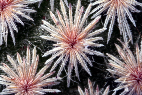 Maihueniopsis bonnieae, premer areole z bodicami 0,5 cm Meristemov je torej več. Meristem za liste, za trne/bodice in meristem za stranske poganjke in/ali cvetove ležijo tesno drug ob drugem. Tako tesno, da mnogi trdijo, da stranski poganjki in cvetovi poganjajo iz areole.