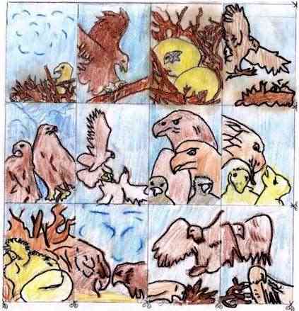 Spodnje slike pripovedujejo zgodbo o orlovi družini, ampak niso razporejene po pravilnem vrstnem redu. Uredi jih po pravilnem zaporedju.