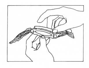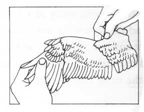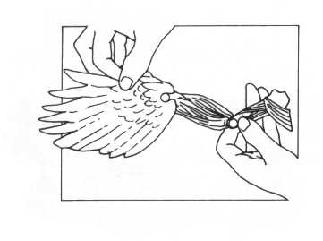 | 4. Nato položi "sekundarna peresa" čez nižji del kosti in mišic. Desna stran mora priti do razcepke, leva pa prekriti primerna peresa in razcepko. Zavihaj trakca in ju prilepi. |