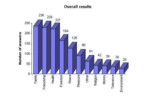 In our country, Friendship is the most respected value. Health and family life are very close. However, other values are statisticaly not so important. It is interesting that Friendship is the most respected value in Slovenia for last ten years or so, since there have been similar researches in the past, so we had a chance to compare the hierarchy of values through relatively long period of time. We believe that such outcome is a result of a tradition in our country.