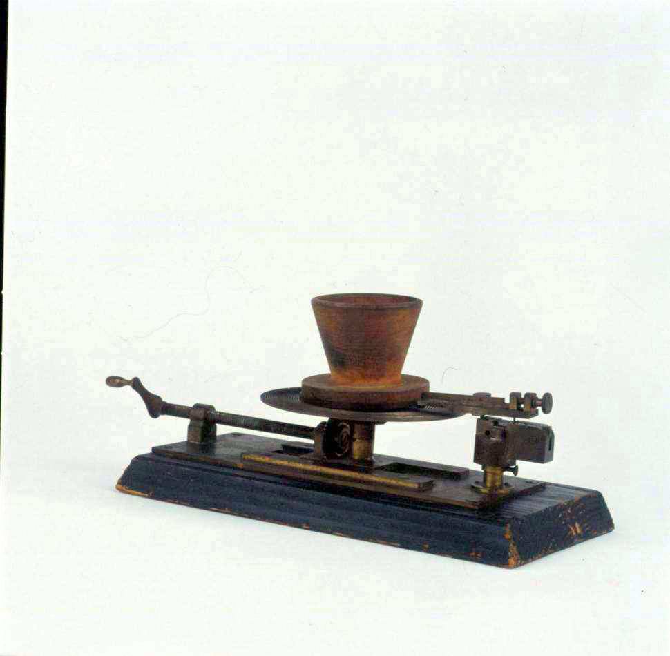 Consisteva in un ricevitore chiuso da un disco di metallo. Il ricevitore aveva una punta fissata a una membrana elastica e una tromba conica di legno. La superficie del disco presentava una scanalatura elicoidale che funzionava da guida per la punta. Il disco era mosso da una manovella. L’incisione poteva essere usata per riprodurre il suono. |