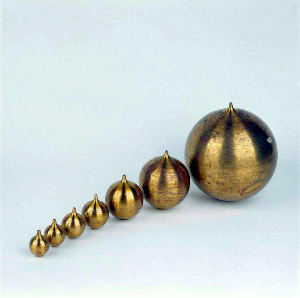 Il risonatore di Helmholtz o “globo di risonanza” è una sfera vuota in ottone sottile con aperture alle due estremità opposte. Il foro più grande riceve il suono, mentre il più piccolo si adatta all’orecchio. L’aria nel globo ha una propria nota fondamentale dipendente dalla dimensione del globo. I risonatori permettevano di analizzare i suoni nelle loro frequenze costitutive e furono uno strumento fondamentale per la teoria della musica. Helmholtz riuscì a riprodurre un suono determinato combinando i suoni componenti evidenziati dai suoi risonatori. |
