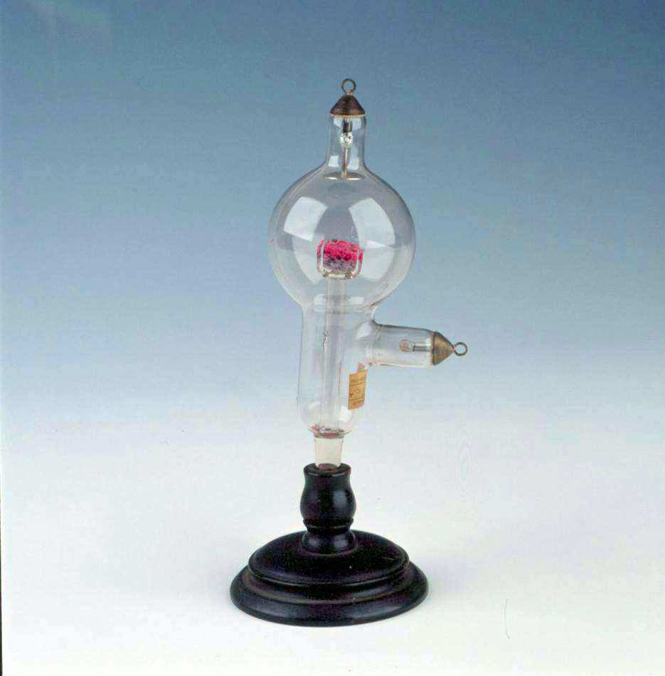 TUBI DI CROOKES CON FRAMMENTO DI MINERALE FLUORESCENTE AL CENTROAnno di costruzione: inizi XX secolo