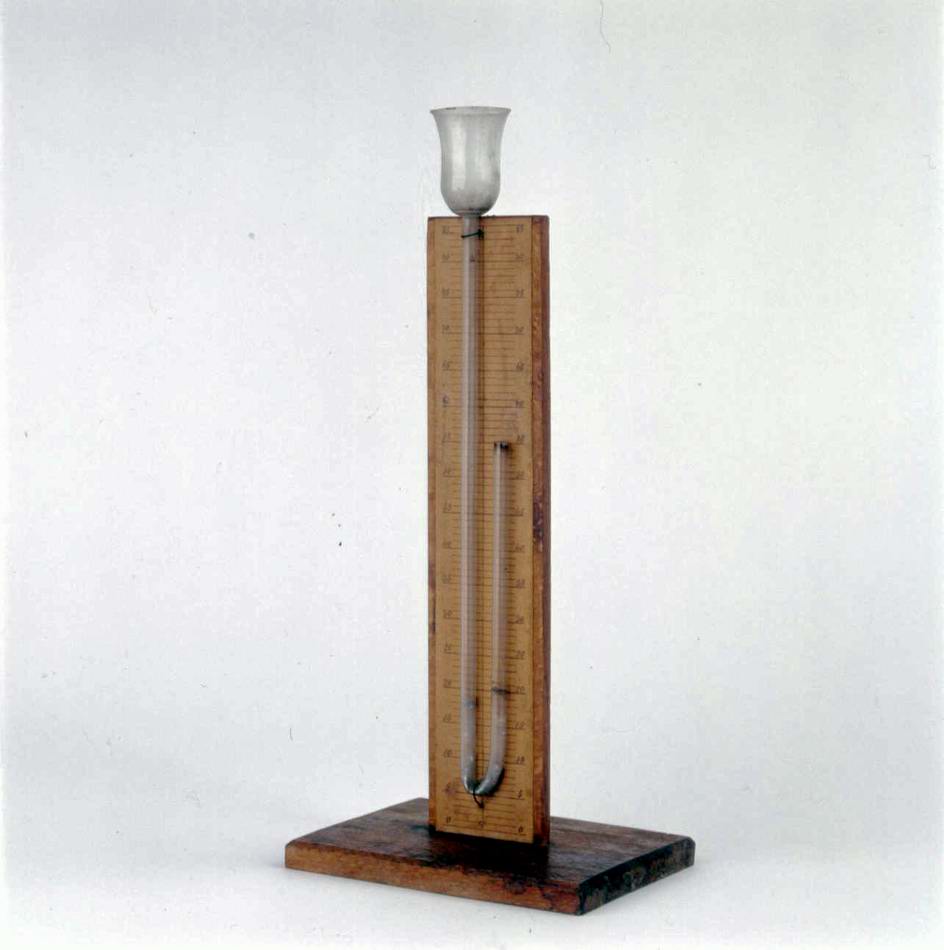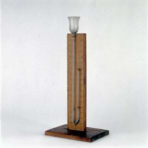 Lo strumento è costituito da un tubo di vetro lungo, fissato ad una tavoletta di legno, ad un’estremità del