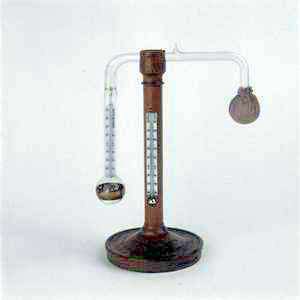 E’ costituito da un tubo di vetro piegato, con un bulbo a entrambe le estremità. Uno di essi, quello posto più in basso, conteneva etere, mentre l’altro, vuoto, era coperto di leggerissima mussola. Il bulbo contenete etere era colorato in blu scuro. Per usare lo strumento, altro etere veniva versato sul bulbo coperto di mussola, quindi sul termometro chiuso nel bulbo di vetro, si leggeva la temperatura alla quale si verificava la condensazione del vapore acqueo sull’altro bulbo. La temperatura dell’aria veniva letta sul termometro esterno. Con queste informazioni, e consultando apposite tavole, si poteva determinare l’umidità relativa dell’aria. |