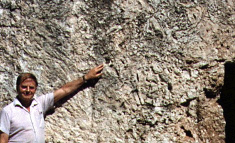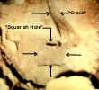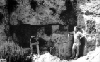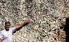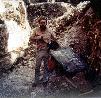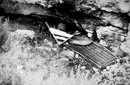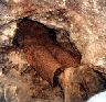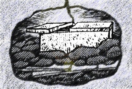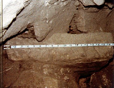kamen, spredaj pa kamnito ploščo, ki nad luknjami štrli iz pečine (oltar?) |