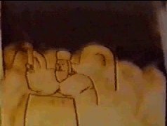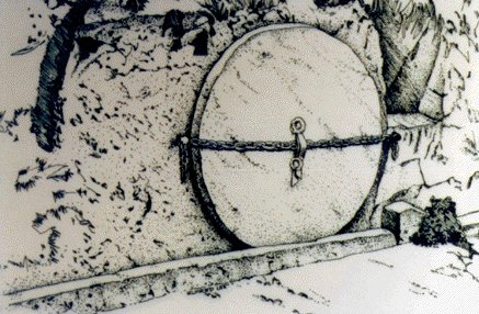 Konča se pri vhodu v grob. Okrogel grobni kamen (ploščo) so privalili k