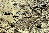 Če stojimo zunaj območja stebrov, pred goro, in imamo "sveto območje" na desni strani, najdemo na levi strani, ob vznožju gore, ostanke oltarja, narejenega iz neobdelanih kamnov. Oltar stoji na strmini, tako da je s spodnje strani visok približno do ramen (odraslega človeka), na zgornji strani pa malo nad kolena. Kot že rečeno, je narejen iz neobdelanih kamnov in brez stopnic. Mojzes je lahko na njem brez težav žrtvoval, če je stal za oltarjem in torej gledal proti množici. (2Mz20,25-26)