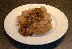 Wash meat, boil in 2 cups of water and salt for about 2 hours. Scrub and mince carrots. Peel, wash and slice onions and add them to the meat ogether with peeled and cut potatoes and carrots. Boil until done (about 30 minutes. Remove meat from pan. Mash all the vegatables and add fat, butter or margarine and pepper. If too thick add some milk (but a spoon must stand up in it). Serve with the sliced meat. The dish is eaten as a main meal dish, either with some soup to start, and followed up with fruit, as the dish is very nourishing. The amount serves 4 people in Holland.