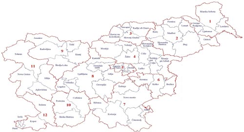 1. Pomurje region 2. Podravje region 3. Koroška region 4. Savinjska region 5. Zasavska region 6. Spodnjeposavska region 7. Region Jugovzhodna Slovenija 8. Osrednjeslovenska region 9. Gorenjska region 10. Notranjska region 11. Goriška region 12. Obalno-kraška region