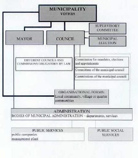 Pursuant to the Local Self-government Act, a Slovene municipality has three bodies: a municipal (town) council, a mayor and a supervisory committee. In the administration of the Municipality the crucial roles are played by the first two bodies, whereas the supervisory committee is the body controlling the public expenditures in the municipality.