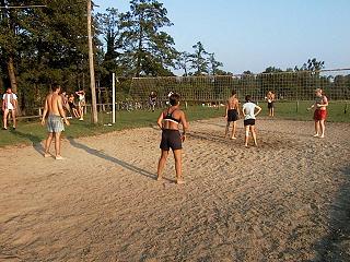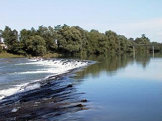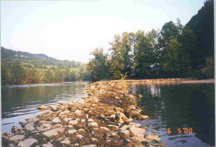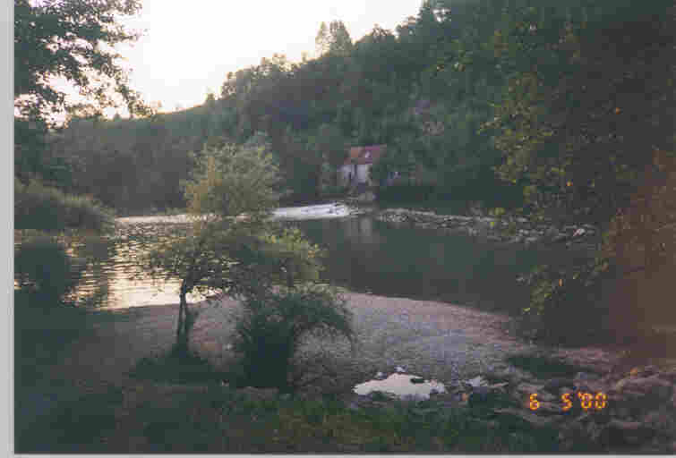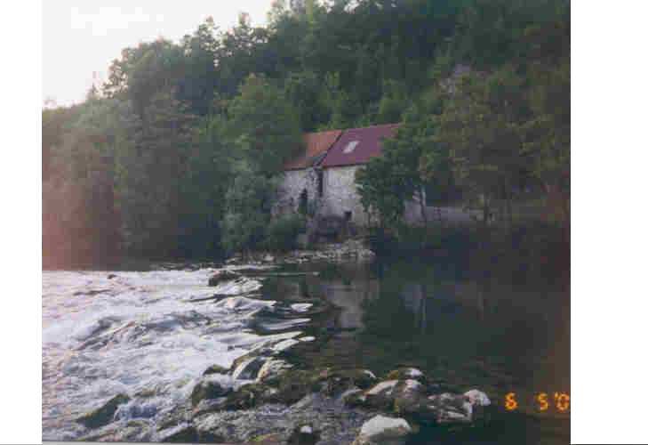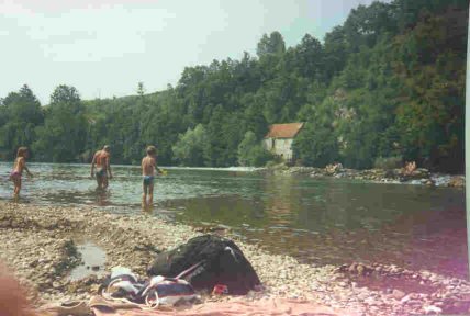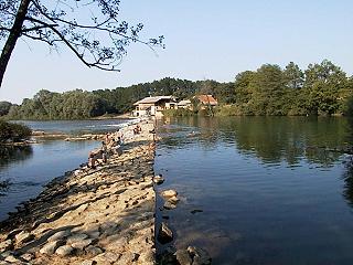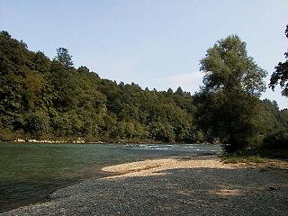 Bathing-place in Adlešiči, in the background there is a mill, which does not mill anymore. Shallows are covered with gravel and in the background we can see 50 meter-high banks.