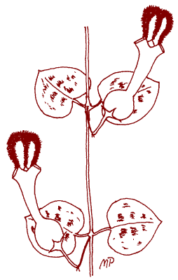 Iz gomolja poganjajo dolga, tanka stebla, ki v času mirovanja odmrejo. Na steblih rastejo parni, nasproti razporejeni, do 10 mm veliki listi. Na stičišču obeh listnih pecljev običajno nastanejo zarodni gomoljčki za zbiranje vode, kjer se tvorijo stranski poganjki. Gomoljčki pri vegetativnem razmoževanju odebelijo in se pretvorijo v korenino. Cvetovi poženejo prav tako iz listnih pazduh. So majhni in neugledni. Venčna cev je zelene barve in rahlo upognjena. V bazi se kotlasto razširi. Venčni listi so temnorjave barve, pokriti z dlakami in z zraslimi konicami. Doma je v Južnoafriški republika (Transvaal, Natal, Kapska provinca) in Zimbabveju. Med stebelne sukulente spada Ceropegia stapeliaeformis HAWORTH. Steblo je sukulentno, zelene barve s sivo ali rjavozelenimi pegami, malo bradavičasto. Listi so reducirani v luske. Stebla so podobna stapelijam, kar nam pove tudi ime rastline. Na spodnji strani plazečih stebel se tvorijo korenine (kot pri stapelijevkah) in konice stebel pogosto prodrejo v zemljo in nekaj časa rastejo pod površino. Kasneje se stebla zravnajo in iščejo oporo za ovijanje, dosežejo pa dolžino nekaj metrov. Cvetovi so vijačno urejeni na oseh socvetja. Venčna cev je dolga do 4 cm in se na koncu lijakasto razširi. Je sivo zelene barve z vinsko rdečimi pegami. Venčni listi so porasli z belimi dlačicami, na konicah so goli in čokoladno rjave barve. Za razliko od ostalih predstavnic rodu, konice venčnih listov niso zraščene skupaj. Ceropegia stapeliaeformis v kulturi ne cveti najraje. Doma je v Južnoafriški republika na vzhodu Kapske province. Zelo neobičajne cvetove imata Ceropegia distincta N. E. BROWN in Ceropegia distincta ssp. haygarthii (SCHLECHTER) HUBER (Ceropegia haygarthii SCHLECHTER). Ceropegia distincta spada med ovijalke s 3 do 4 mm debelimi, golimi, zelenimi stebli z nasprotnimi parnimi, rahlo mesnatimi in ovalno-suličastimi listi. Cvetni pecelj je obrnjen navzdol in rahlo ukrivljen navzgor. Ta ukrivljenost se podaljša tudi na venčno cev tako, da je cvet že v zravnani legi. Venčna cev je dolga 3,5 cm, je svetlozelene barve z vinsko rdečimi pegami. Venčni listi so na konicah zraščeni, zato ima cvet “okna”, ki so značilna za rod. Zraščene zožene konice venčnih listov tvorijo stebriček, ki se imenuje stipelum. Pri tipični vrsti je dolg le nekaj milimetrov, pri podvrsti pa je močno podaljšan, dolg je do 3cm, in je dobro opazen. Ceropegia distincta je doma na otoku Zanzibar, Ceropegia distincta ssp. haygarthii pa je doma v južni Afriki (Natal, Transvaal, Kapska provinca). |