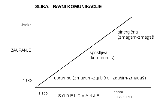 zaupanje veliko, uživajo v ustvarjalnem sodelovanju, iščejo nove rešitve, ki so za vse dobre. Posvečajo se rezultatom in hkrati gojijo dobre odnose, zato dosežejo ravnotežje P/PS (ravnotežje med učinki in sposobnostmi, odnosi).- Nekje vmes je spoštljiva komunikacija, pri kateri se udeleženci trudijo, so vljudni, a niso odprti, ne ustvarjalni. Rezultat je dober kompromis (uspeh zmagam–zmagaš na nižjem nivoju).