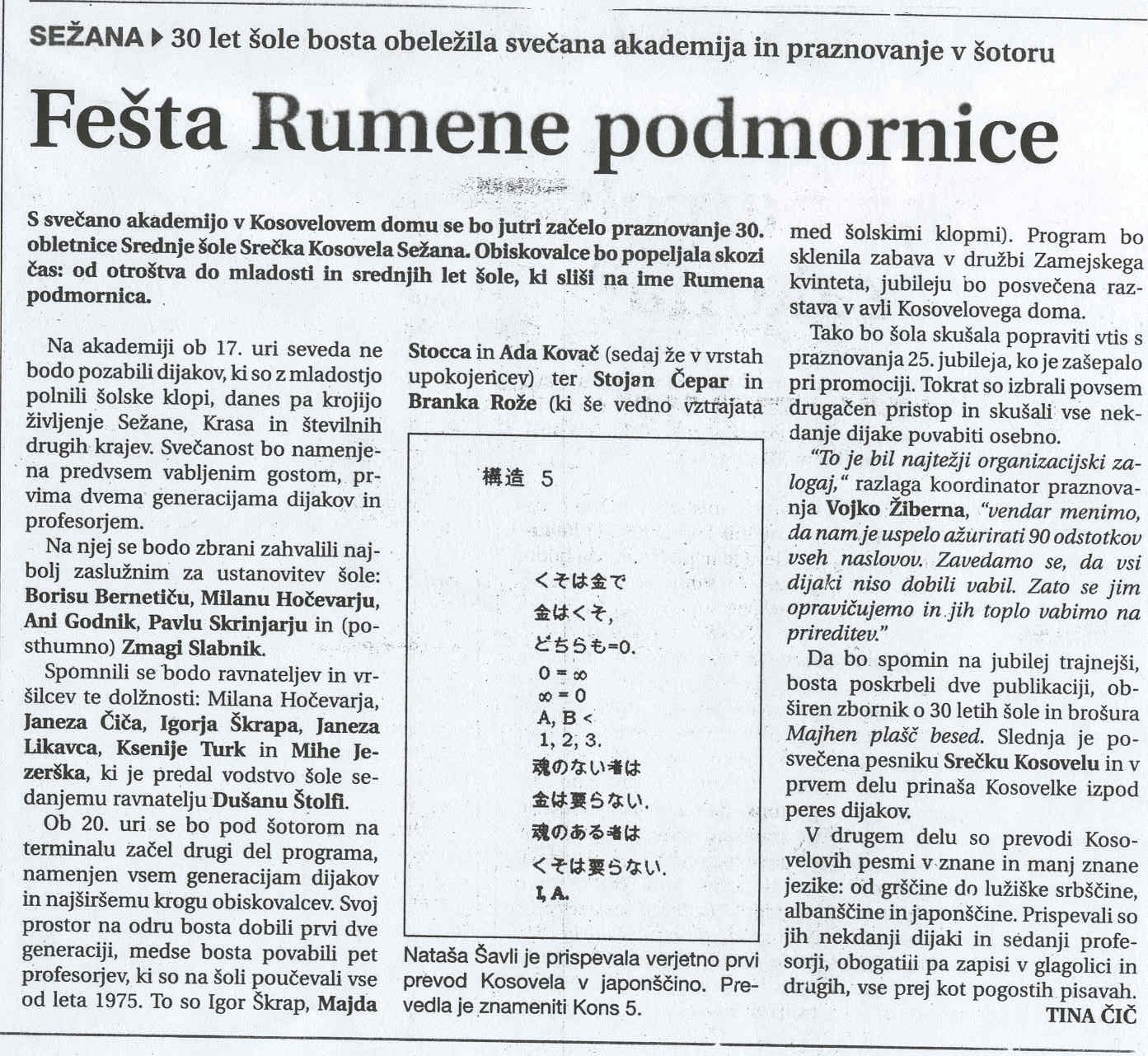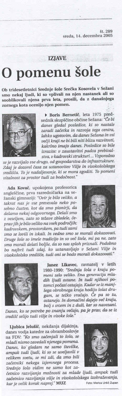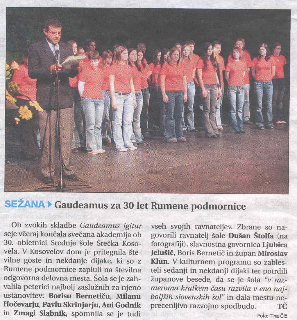 Fešta rumene podmornice, Primorske novice 08.12.2005, št. 284 Gaudeamus za 30 let Rumene podmornice, Primorske novice 10.12.2005, št. 286 Dijake je treba voditi in O pomenu šole, Primorske novice 14.12.2005, št. 289