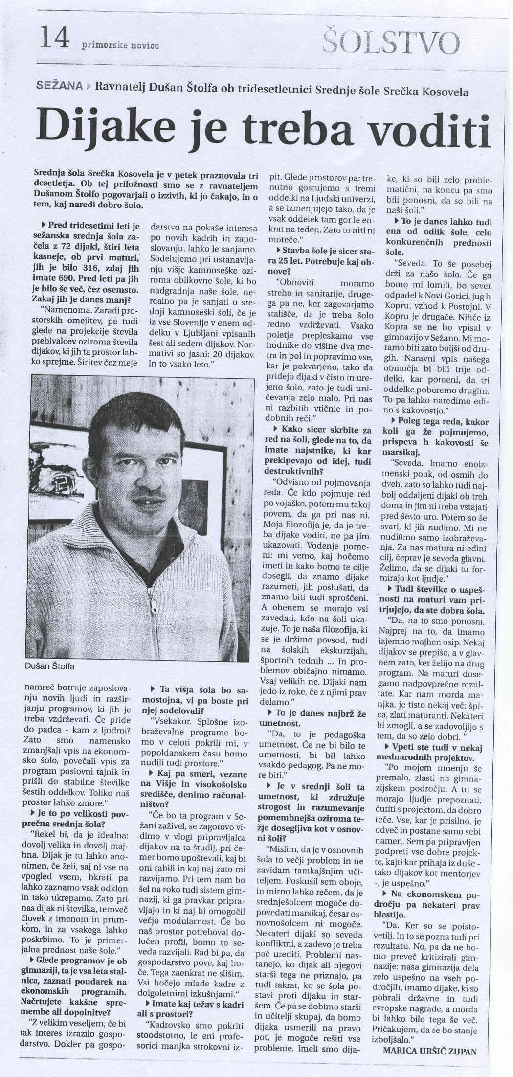 Dijake je treba voditi in O pomenu šole, Primorske novice 14.12.2005, št. 289