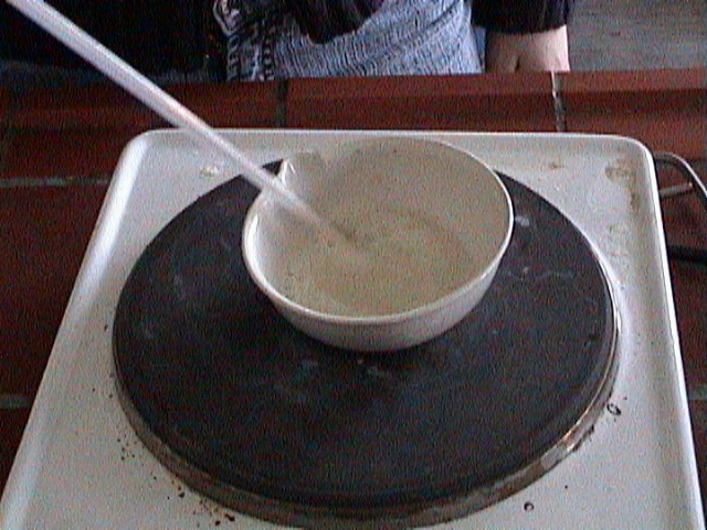 Pri vaji smo skuhali milo iz natrijevega hidroksida(2 g), vode(10 ml), etanola(5 ml) in belega olja(10 ml). Dobljeno milo smo izsolili z nasičeno raztopino NaCl in nato preko gaze v stekleni kozarec.