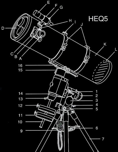 A - Okular. B - Fokuser. C - Vijak za ostrenje slike. D - Zaščitni pokrov. E - Iskalo. F - Nosilec iskala. G - Pritrdilni vijak iskala. H - Fiksirni vijak okularja. I - Transportni nastavek. J - Pritrdilna obroča cevi. K - Telo optične cevi. L - Primarno zrcalo. 1