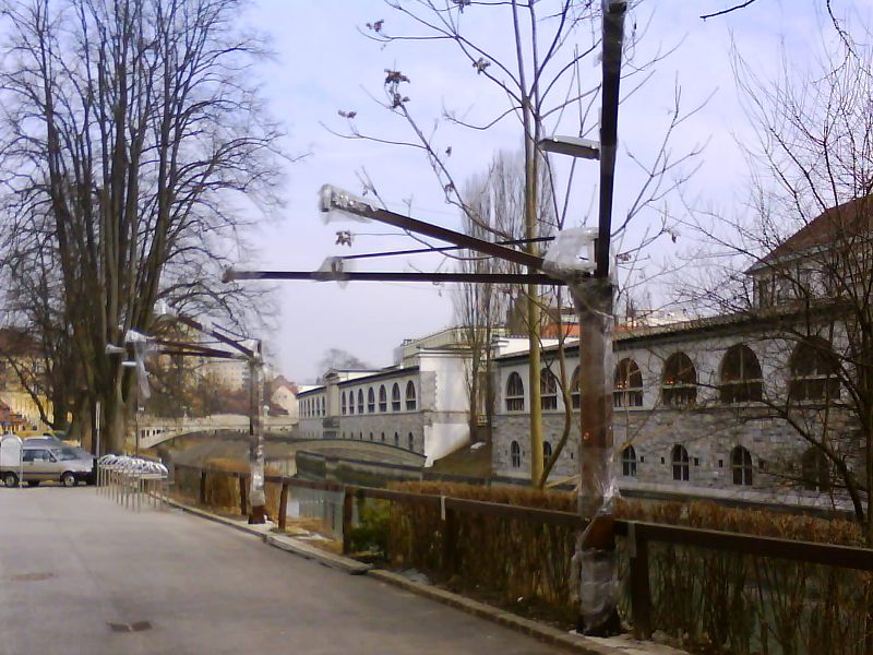 | Na Petkovškovem nabrežju so namesto lip postavili kovinska drevesa. |