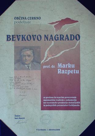 Marko Razpet je med drujm tut za díla na tem spletišu dabiu Beukaua nagráda uapčine Cíerkna za líta 2002. Praj'je, de za predánu n uspíšnu pauezuajne matematične tradicje z zdejšnm cajtam n za usestranska pramacje damačih mpa pedaguoških patencjálau Crklajnske. Uan bi se na tem místu rat za tú zahuálu usem sajm sadílaucam, ka sa se mátral po'r muštrajnu tega spletiše, narbel pa gaspúdu Štíefnu Rutarju mpa gaspúdu Stanetu Uršiču za nesebična pamúč po'r tem uaprauilu. Usem Búh luonaj!