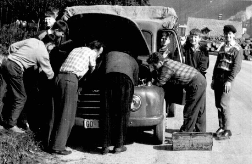 | Organizacija izleta je bilo tista leta pravi podvig. Najeli smo manjši tovornjak, mislim da je bil to tisti, s katerim so prej pobirali mleko po Cerkljanskem. Nanj so dali cerado in klopi, pa smo bili pripravljeni za odhod. Takih voženj smo bili že vajeni, saj nas je Čerinov Janez na precej večjem tovornjaku že vozil v Postojnsko jamo in Portorož, pa v Planico in morda še kam. Pa gasilce tudi. Seveda je bilo za prevoz živega, razposajenega in nepredvidljivega tovora potrebno imeti posebno dovoljenje. Avtobusi so bili takrat redki, pa še ti so vozili večinoma le na rednih progah. | ![]() |